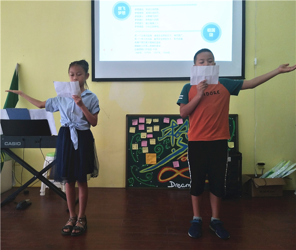 为展示实践队与小朋友们活动12天以来的收获与回忆,7月25日,实践队带领爱邻社的孩子们在活动地点举行了汇报演出。