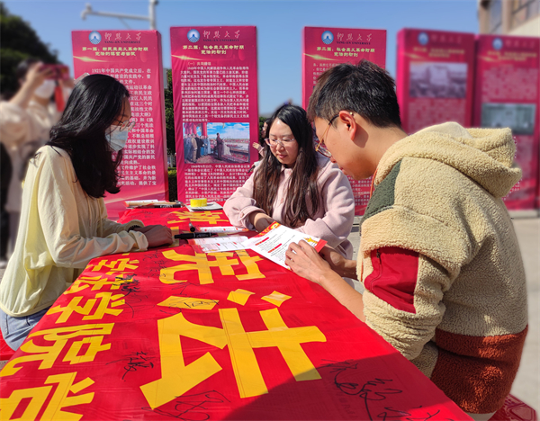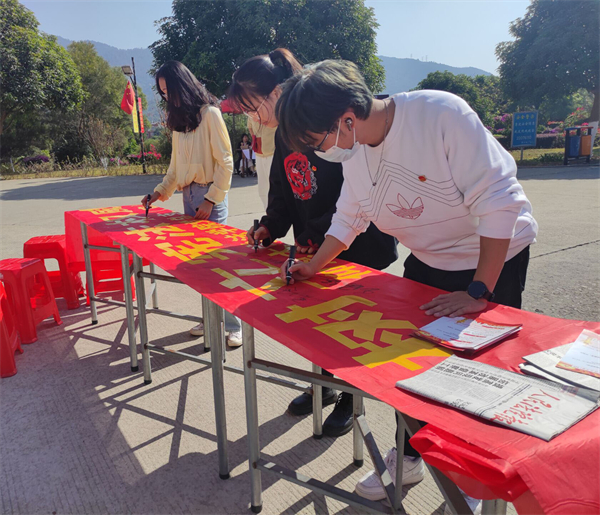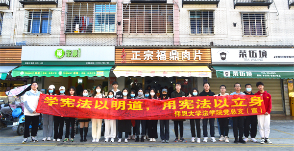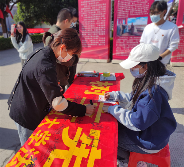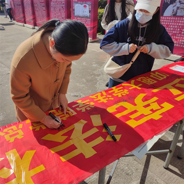 本次活动紧扣““学宪法以明道,用宪法以立身””的主题开展。活动现场,工作人员通过悬挂宣传海报、发放普法资料手册,横幅签字、现场讲解等方式,向在场师生详细阐述了宪法规定的权利义务、中国宪法制度的历史发展等相关知识点,营造了浓厚法治氛围。同时,工作人员结合相关宪法知识,从出生到退休的实际出发,对宪法与自身一生的关系进行了深入浅出、通俗易懂的宣传,让宪法真正走近师生心田,让宪法为其梦想保驾护航。