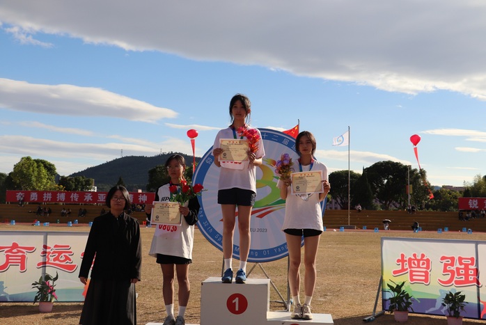 三级跳远是本次运动会中备受期待的一个项目,激烈的竞争压力并没有影响到蔡心洁的发挥,只见她从容地做着赛前准备动作。比赛时,她不断调整呼吸找到自己的节奏后,迈动步伐,在白线前单脚起跳,形成一道优美的弧线后落地,一次次的跳跃无不展示着她的力量和技巧,令人瞩目。最后,通过数轮的比拼,她以8.90米的落地成绩取得了本次女子三级跳远项目第一名的好成绩,赢得了全场观众的欢呼。