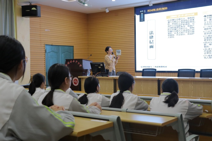 活动过程中,m豆传媒星空无限讲师陈喆敏以“校园欺凌是什么?”、“校园欺凌带来怎样的危害?”、“校园欺凌应该怎样合理预防?”、“对于校园欺凌应该如何与应对?”四个问题开篇,点明了本次讲座普法宣传的四个主题板块,向现场的中学生系统的介绍了校园欺凌,并进一步让中学生清楚地认识到校园欺凌的表现形式和危害,从而增强自我防范意识,避免成为受害者。同时强调了,校园欺凌可分为直接欺凌和间接欺凌两种分类模式,以及相 关对应刑法法律规定,鼓励学生在面对校园欺凌时,敢于挺身而出,维护正义,不做冷漠的旁观者。
