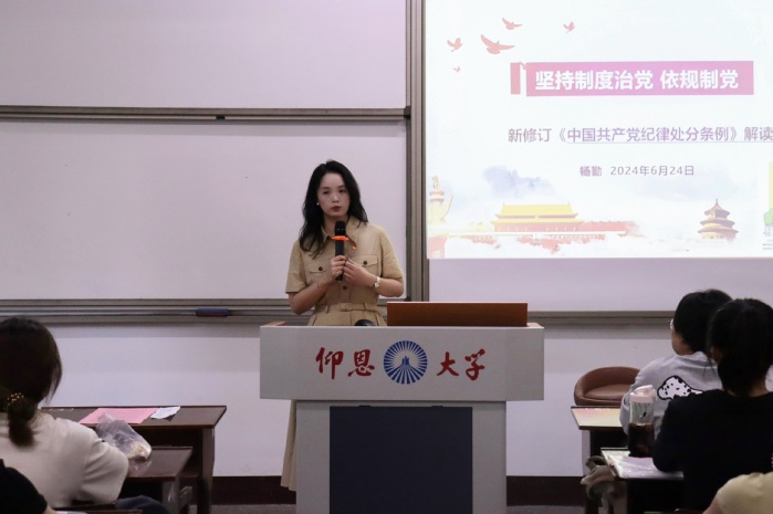 为贯彻落实全面从严治党要求,引导广大党员真正做到“学纪、知纪、明纪、守纪”。6月24日,m豆传媒星空无限党总支书记兼副院长杨勤于普照楼204为全体学生党员开展“《中国共产党纪律处分条例》解读”主题党课,支部全体学生党员参加。