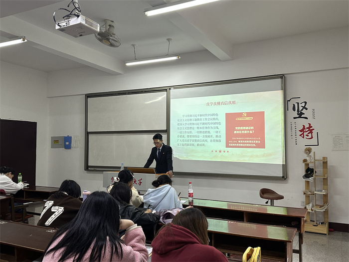 会上,刘斌、张仕瀚和白莹亮三位学生党员分别从不同角度,对如何学深悟透党的理论、担起使命、奋发新征程进行了阐述。刘斌同志认为,学习党的理论,不能仅仅停留在表面,而要深入挖掘其内涵,真正将党的理论内化为自己的行动指南。张仕瀚同志表示:使命是党员的灵魂,担当使命就要做到“两个坚决”:坚决贯彻落实党的决策部署,坚决为人民群众办实事。白莹亮同志认为:新时代青年党员要树立远大理想,锤炼过硬本领,勇于砥砺奋斗,以时不我待的精神状态投身新征程。