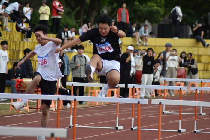 比赛当日,赛道旁掌声雷动。被分在第四组第三跑道的邱浩楠,在发令枪响的瞬间迅速起跑,起跑反应敏捷,前半程始终保持稳定节奏。面对各学院的选手,竞争异常激烈,中途跨越栏架时,他虽因节奏小幅波动与前方选手产生差距,但并未气馁。